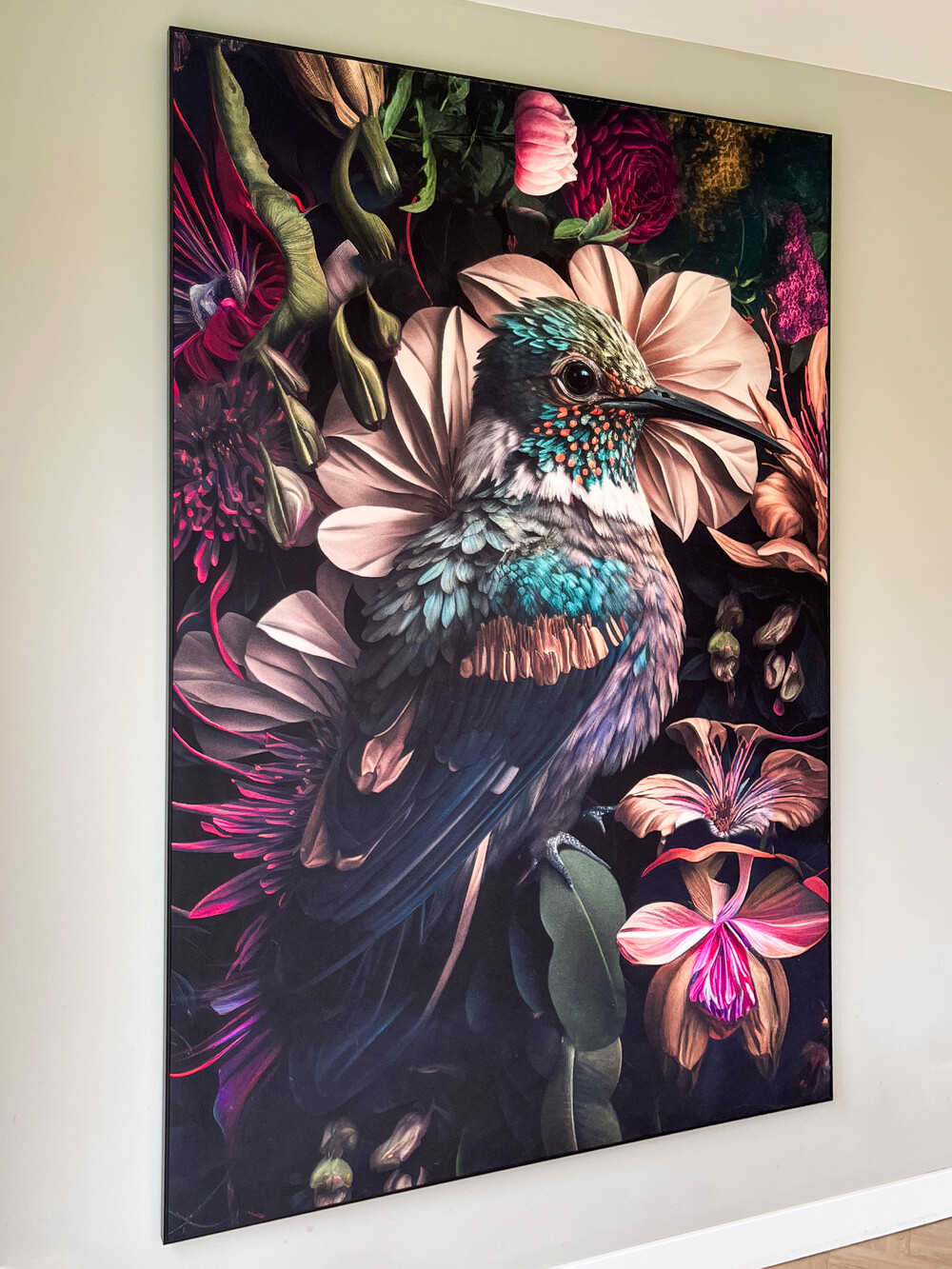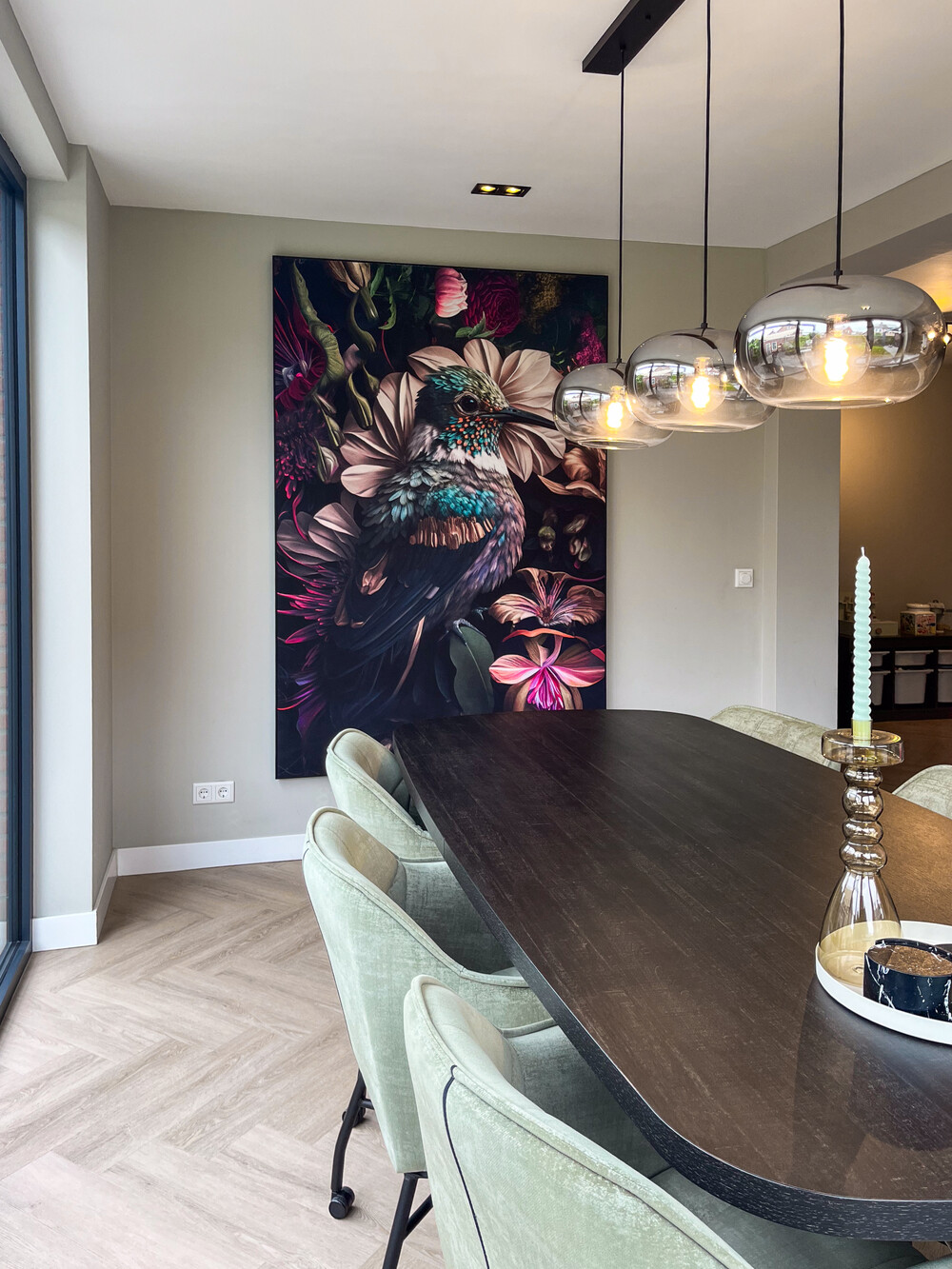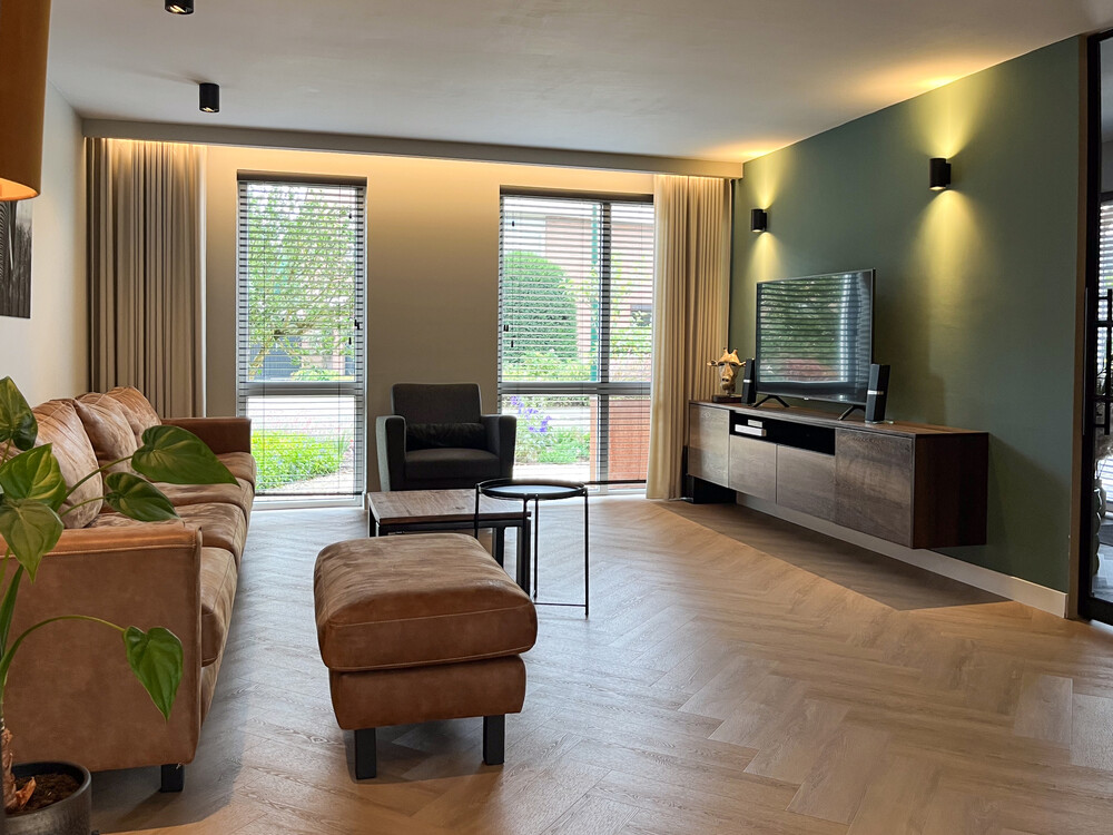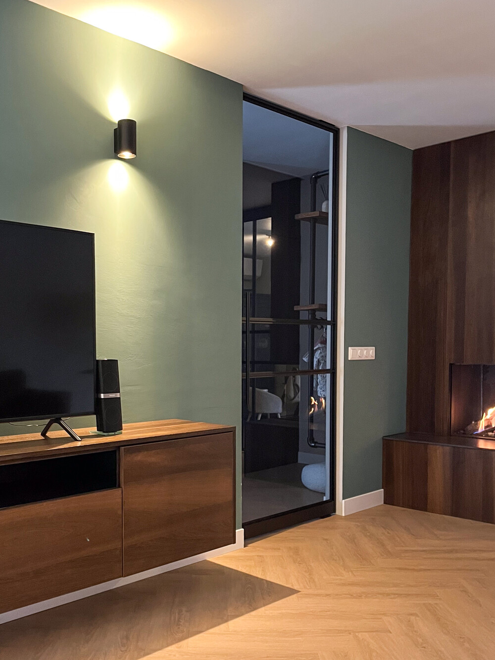 De grote bank vormt het hart van de woonkamer. De haard en kastenwand zijn tot één geheel ontworpen, waardoor de ruimte met elkaar verbonden zijn. Warme tinten en natuurlijke materialen zorgen voor een uitnodigende basis, terwijl accenten in groen en roze het interieur een frisse, eigentijdse uitstraling geven.